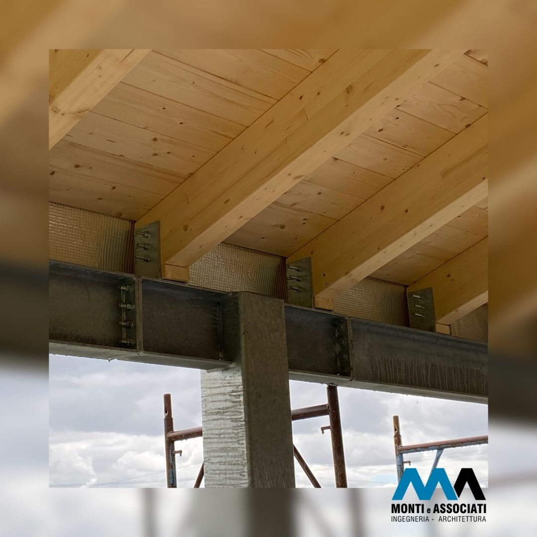 - Copertura con travi in acciaio e pannelli sandwich che integrano uno strato isolante centrale in lana di roccia, racchiuso tra due lamiere d’acciaio preverniciate; questa configurazione assicura un eccellente isolamento termico, protezione dagli agenti atmosferici e un’ottima durabilità nel tempo;