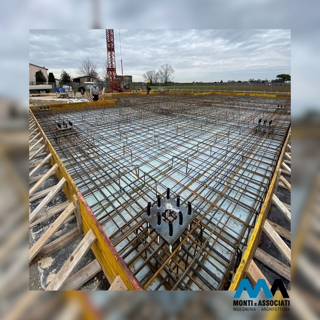 Le fondazioni sono stata realizzate in calcestruzzo armato, utilizzando sia soluzioni a platea, ideali per una distribuzione uniforme dei carichi, sia sistemi a travi rovesce di sezione rettangolare, pensati per resistere efficacemente alle sollecitazioni su terreni di diversa consistenza