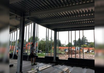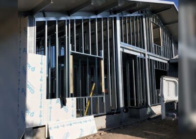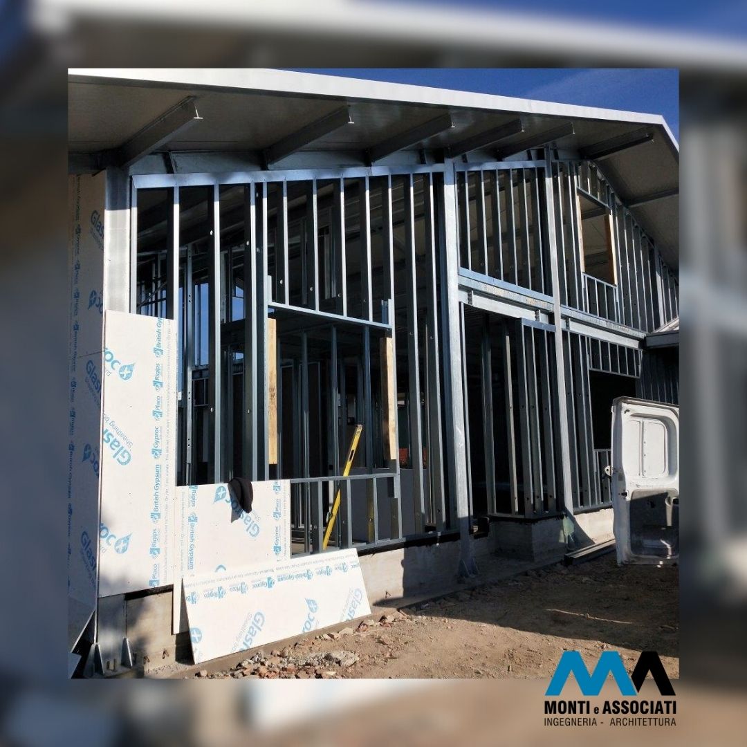 - Pareti perimetrali realizzate con a secco, formate da pannelli modulari montati su una sottostruttura metallica. Questo sistema consente una rapida installazione e garantisce elevate prestazioni termiche e acustiche, grazie all’integrazione di materiali isolanti all’interno delle intercapedini.