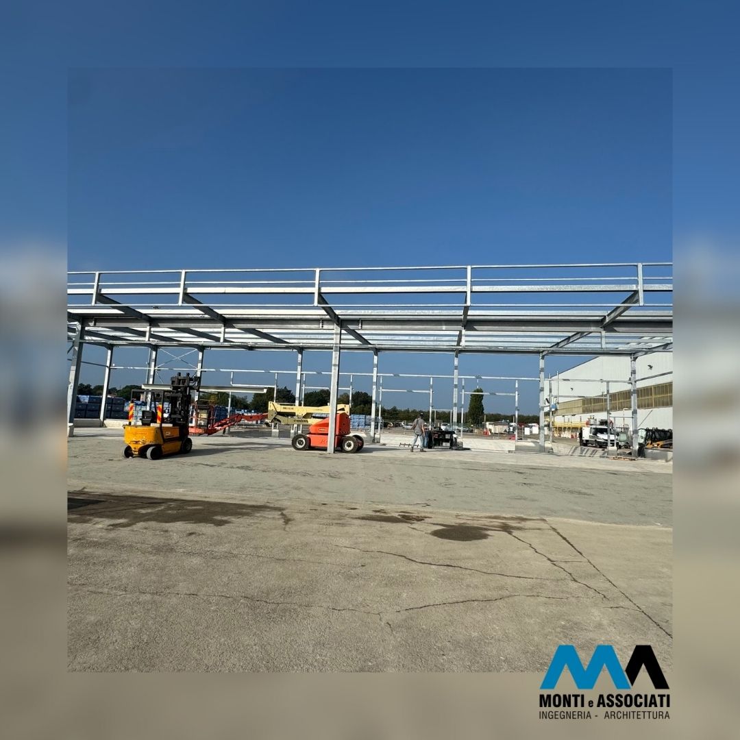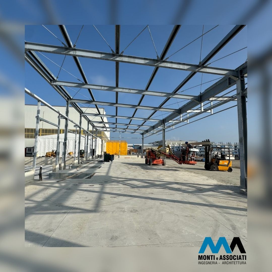 A completamento della struttura, su entrambi i lati lunghi del fabbricato sono state realizzate due pensiline, anch’esse con copertura in pannelli sandwich, che avranno la funzione di proteggere le aree di carico e scarico dalle intemperie.