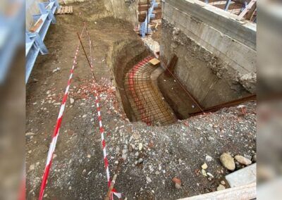 Per garantire l’accesso carrabile al piano interrato, viene realizzata una rampa curva in cemento armato, pensata per resistere ai carichi dinamici e per consentire un collegamento agevole e sicuro con il piano stradale.