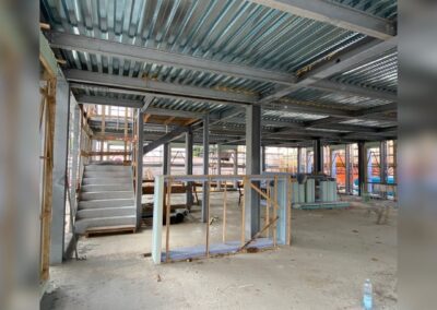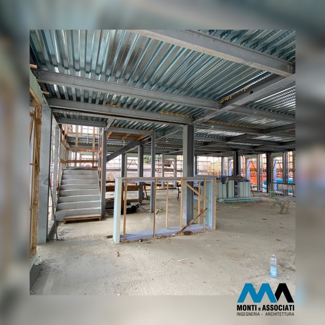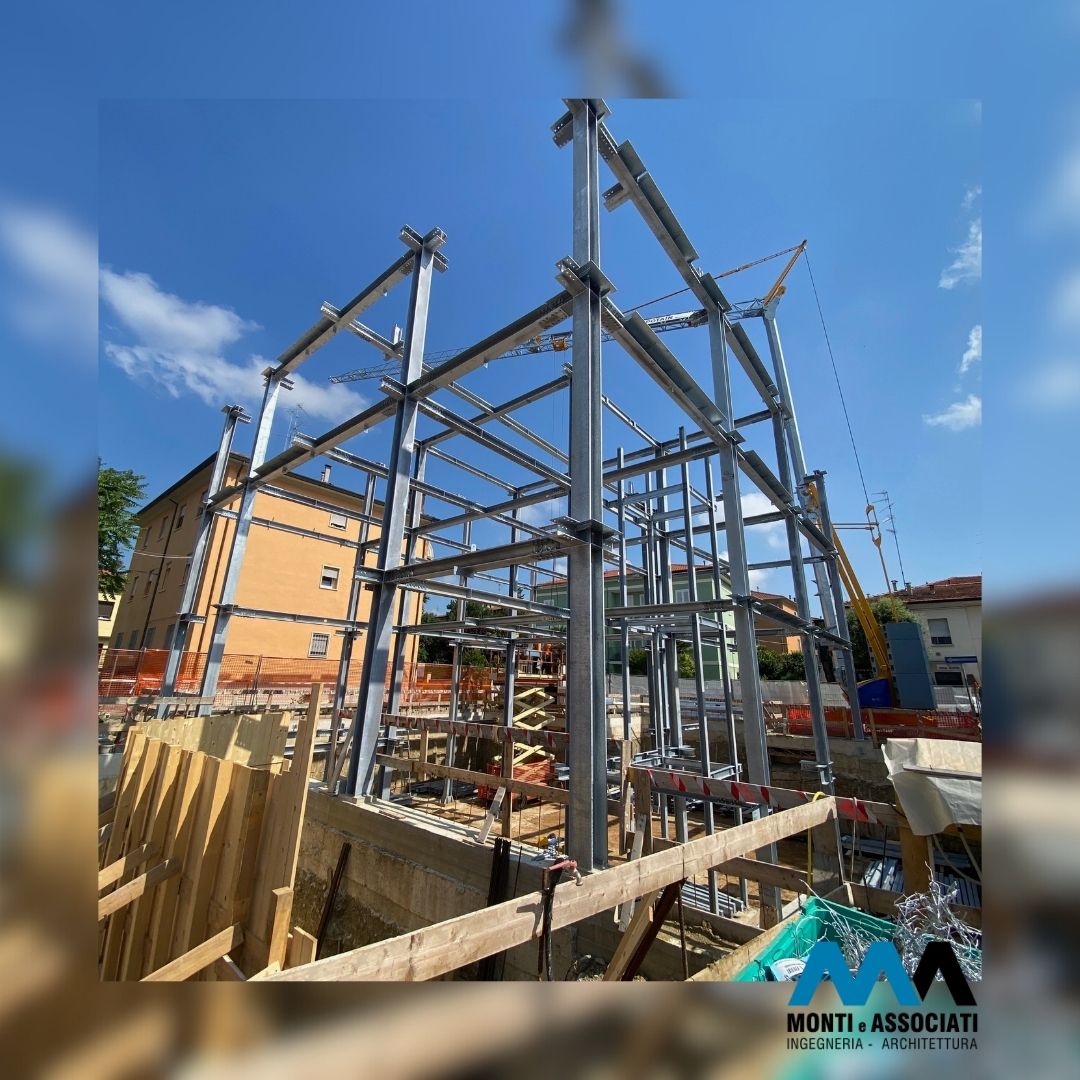 Data la presenza di edifici adiacenti, si è reso necessario progettare il piano interrato con pareti perimetrali in diaframmi di cemento armato, che offrono sia contenimento contro la spinta del terreno che una solida base di supporto per la struttura in acciaio in elevazione.